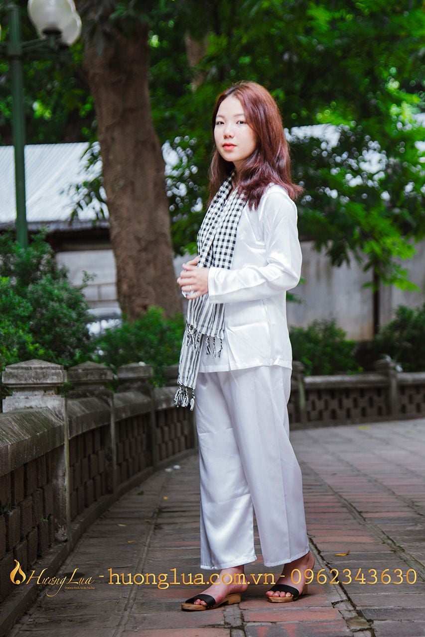 Áo bà ba đi lễ cô Sáu chất liệu vải phi bóng trắng đi lễ cô Sáu rất thanh lịch, dịu dàng.