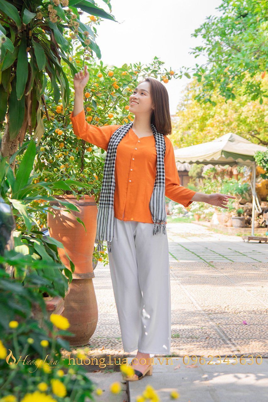 Áo bà ba lụa Thái Tuấn màu cam kết hợp cùng quần bà ba lụa Hàn Quốc trẻ trung thanh lịch phù hợp mặc đi lễ chùa, đi du lịch, đi tham quan.